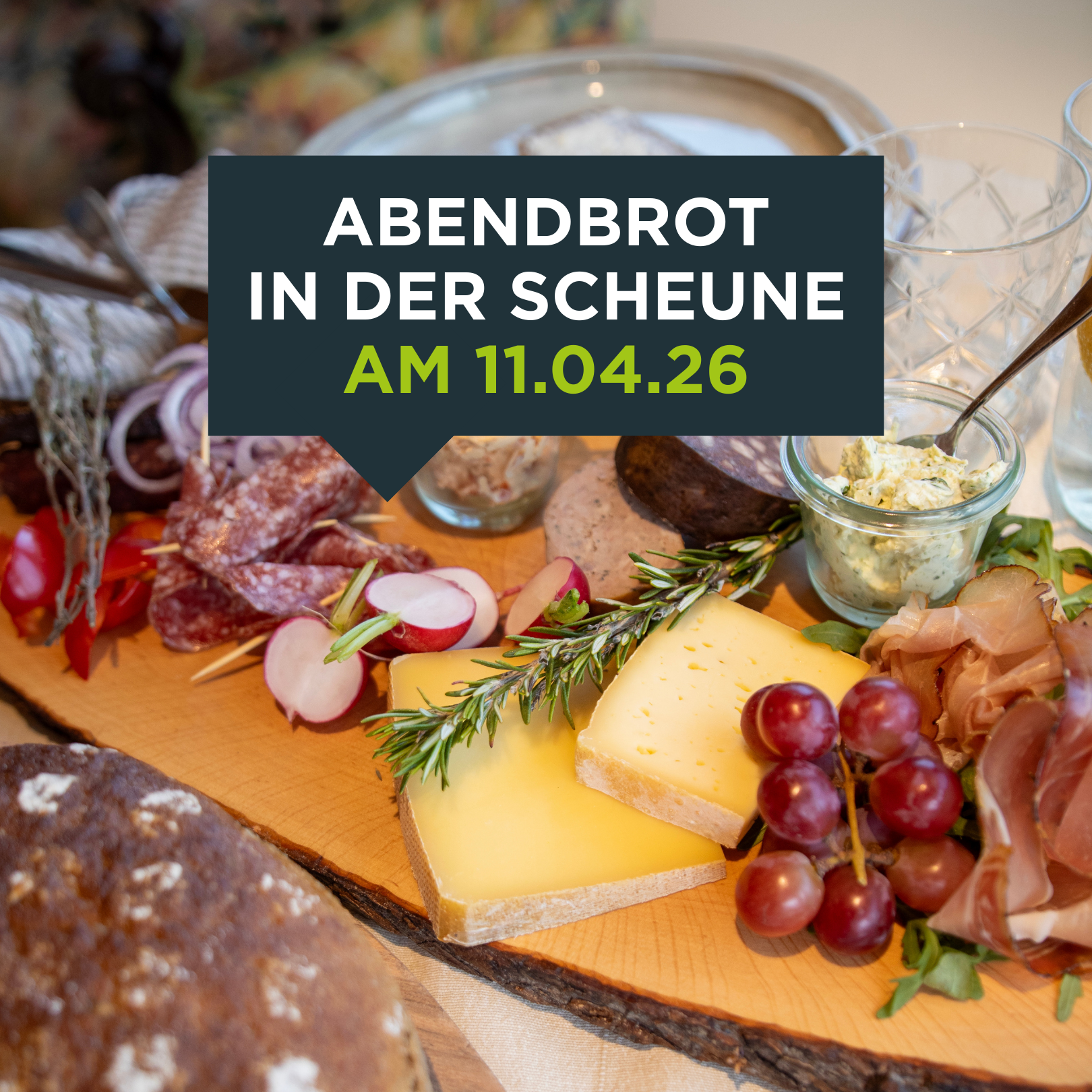 Ein geselliger Abend zum Teilen und Genießen: Am 11. April gibt’s ab 18 Uhr Abendbrot in der Scheune. Wir servieren Brotzeitplatten mit frischem Brot, besten Antipasti, Aufstrichen, einer phänomenalen Käse-, Schinken- und Wurstauswahl sowie kleinen Snacks zum Teilen. Im Preis von 39,90 € sind das Abendbrot und Wasser enthalten. Tickets gibt’s im Onlineshop unter www.scheunenshop.com